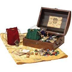 Go back in time with the pirates sail the seas, find buried treasure, locate islands, and escape hungry sharks in this family fun Dread Pirate game. The game is a perfect pastime for anyone with an imagination and includes everything an ordinary pirate would need from ships and doubloons, to jewels and maps. In the game you will choose a ship and then take part in an exploration for your treasure along with the other players. At the end, whoever ends up with the most treasure wins! Everything you need to play comes in a handsome dark finish wood pirate chest that can be attractively displayed in any home, office or study. 11" L x 8-1/2" W x 5" H